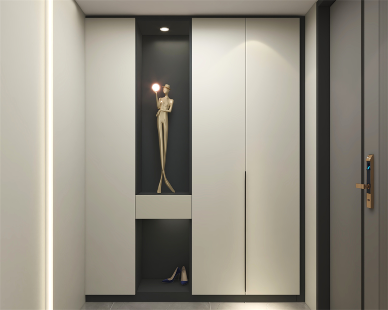 整體風格為現代簡約風。整個空間做到了櫃牆門一體化,色係統一協調。櫃體櫃門運用了澀黑,澀感白兩個顏色。軟裝上冷暖色調隨意搭配。材料上整個采用了糠醛板,環保、堅固還防潮。家裏老人小孩都不用擔心。收納區域也是足夠多,做到了美觀且實用。設計理念:以人為本 ,設計有歸屬感的家,做有溫度的設計師。整家之美|第五屆黄瓜视频免费下载杯全國家居空間設計大賽